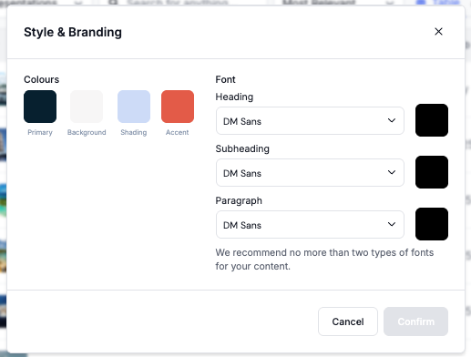 3. Style & Branding: This tab allows users to edit the font and colour preferences that shows as default for all Presentations that are created. Past presentations will not be affected by changes here.
